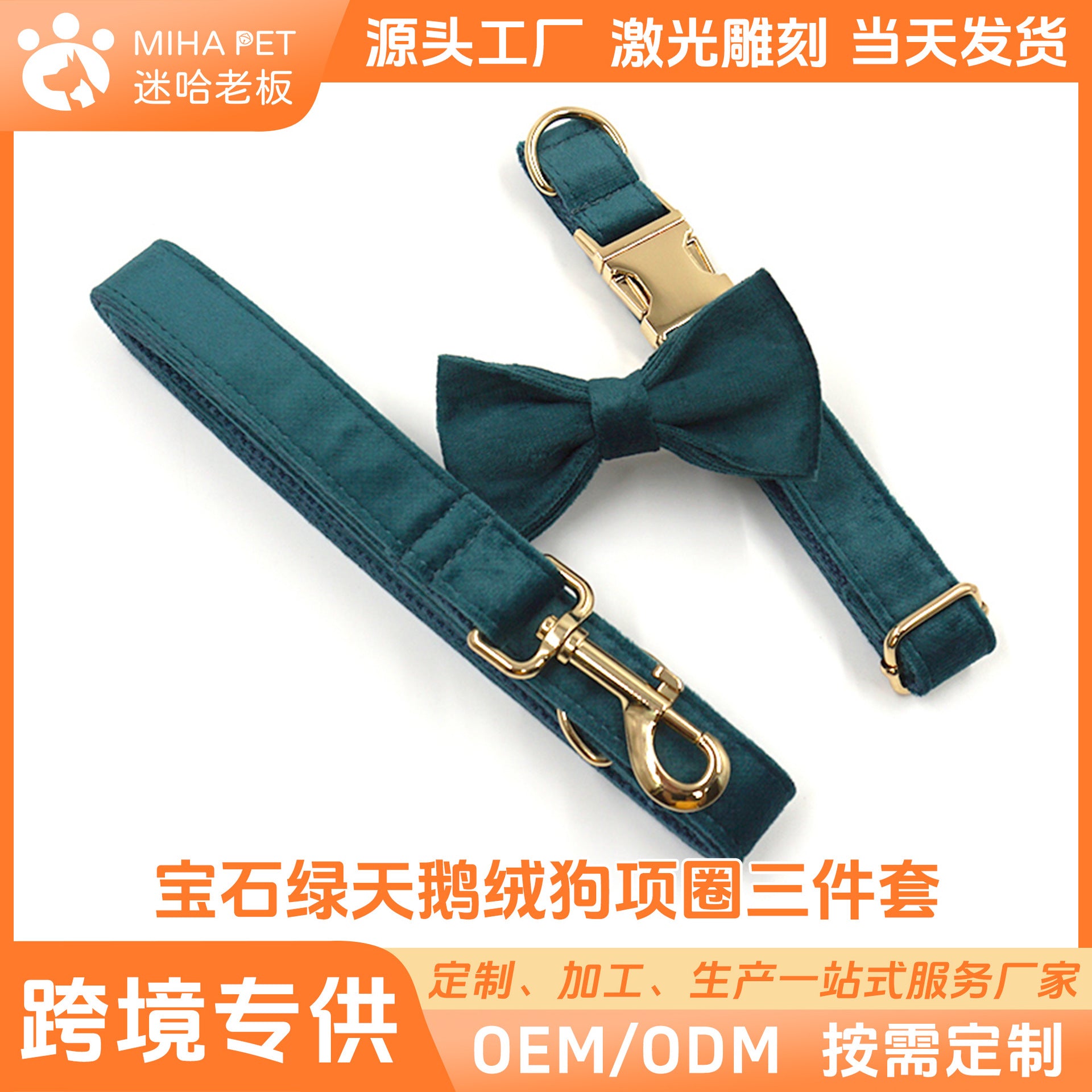 金扣宝石绿绒宠物项圈牵引绳蝴蝶结套装 跨境刻字狗脖圈狗绳领带